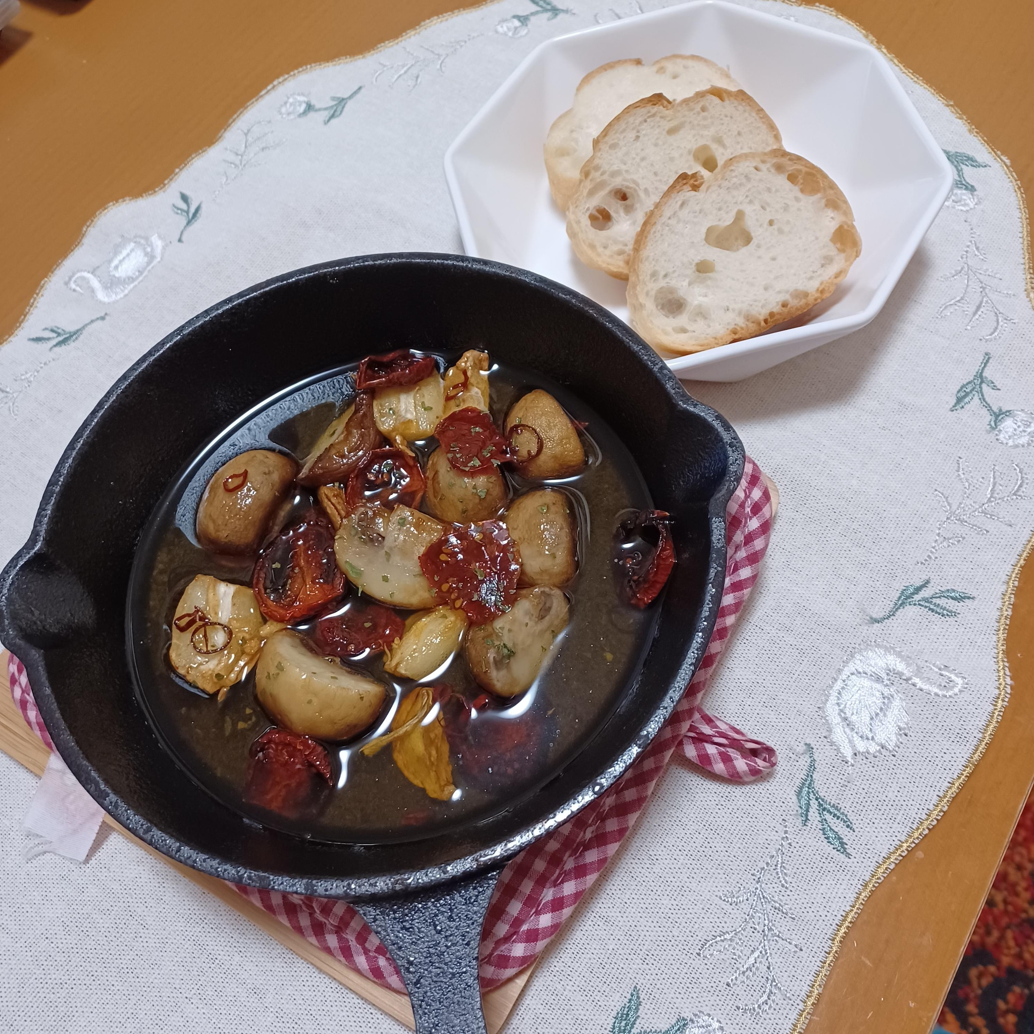 ② スキレットにオリーブオイル、にんにく、鷹の爪を入れて弱火にかける。